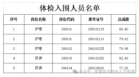 请体检入围人员于2026年3月16日(星期一)上午7:30携带本人有效居民身份证到安徽省百佳信人力资源服务有限责任公司(庐江县文昌路66号人社局大院内)集合,逾时不到者视为自动放弃。